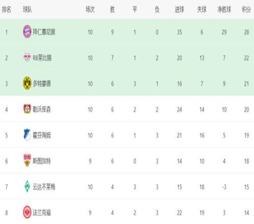 在积分榜上,拜仁以28分排名榜首,战绩是9胜1平,是德甲唯一保持不败的球队。莱比锡以22分排名第2,落后6分。多特蒙德排名第3,拿到21分。勒沃库森大胜之后缩小与身前球队的差距,以20分排名第4。霍芬海姆拿到19分,排名第5。第6的是斯图加特,拿到18个积分。